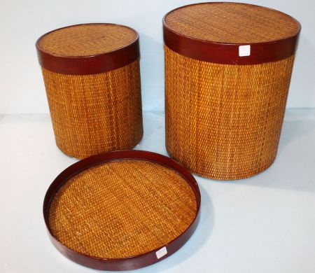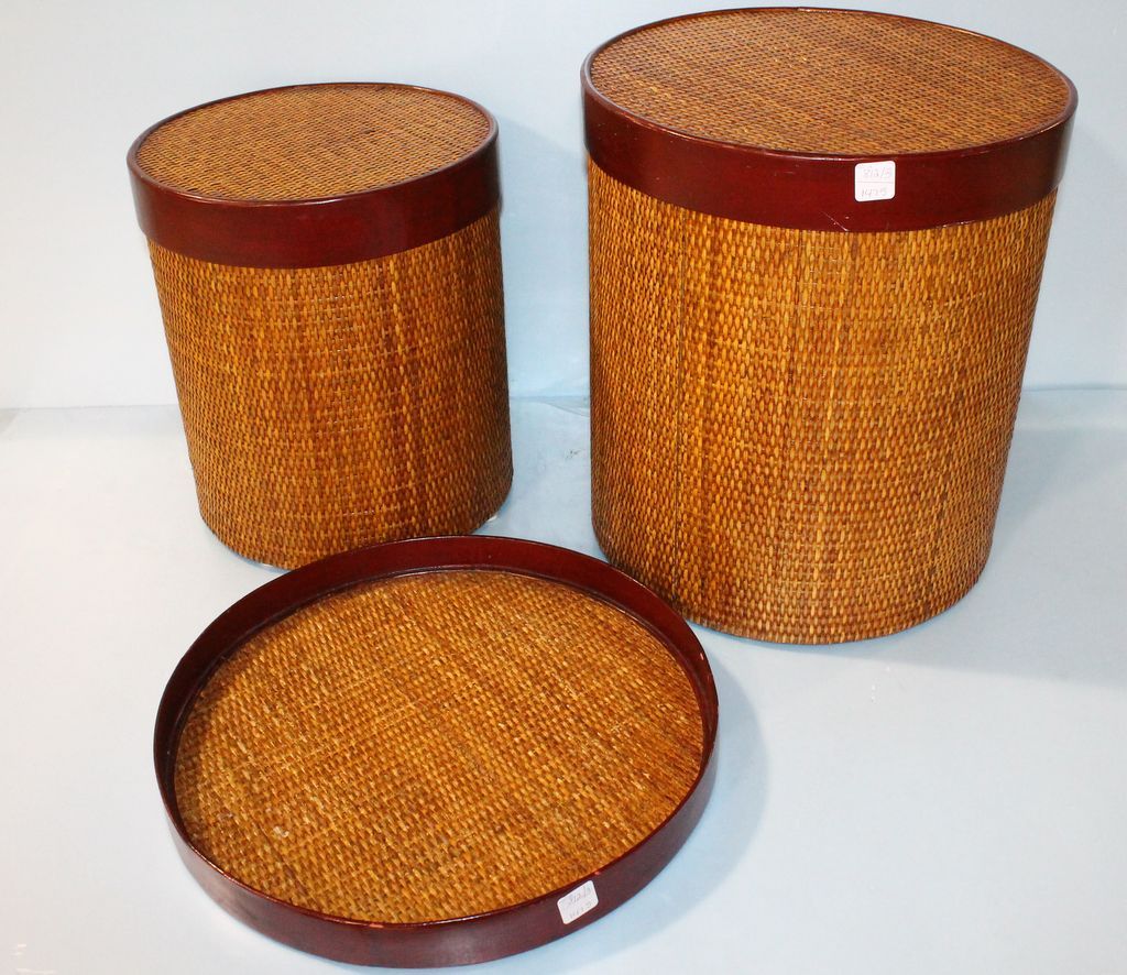 Tray 15 1/2" dia.; Storages Boxes 14 1/2" dia., 16" h. & 11 1/2" dia., 13 1/2" h. Tray 15 1/2" dia.; Storages Boxes 14 1/2" dia., 16" h. & 11 1/2" dia., 13 1/2" h.