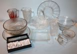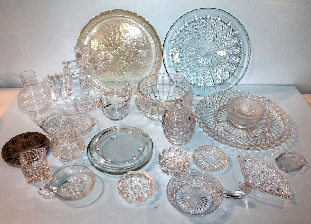 904 Table Lot of Glass Pitchers, Bowls, Trays, Baskets & Trivets