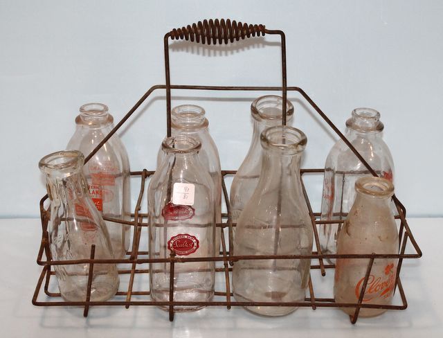 1091 Eight Glass Vintage Milk Bottles in Carrier