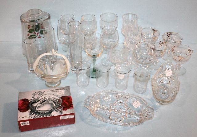 1098 Group of Various Size Glasses, Apple Shaped Glass Dish, Glass Dishes, Cookie Jar, and Glasses