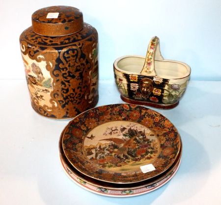 1109 Oriental Design Ginger Jar, Basket, Three Plates