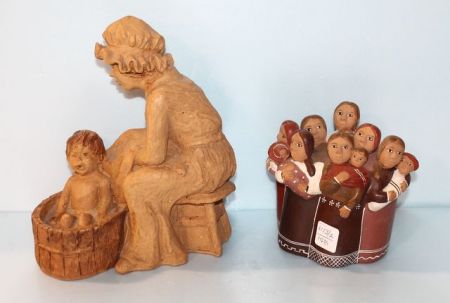 1113 Ceramic Made in Peru Group of Indians & Wood Carving of Mother Bathing Child