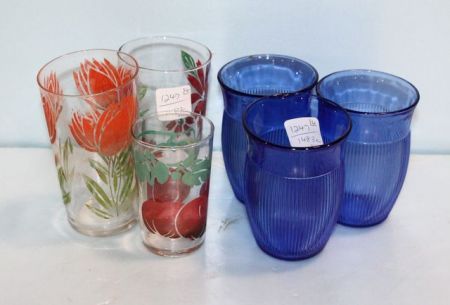 1247 Three Blue Juice Glasses & Three Red Flower Juice Glasses