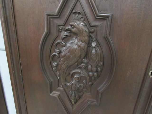 Stained Oak, beveled glass door, two piece, bottom has three drawers, carved birds on side doors, carved border, has key. Stained Oak, beveled glass door, two piece, bottom has three drawers, carved birds on side doors, carved border, has key.