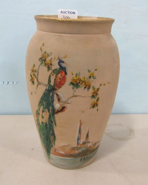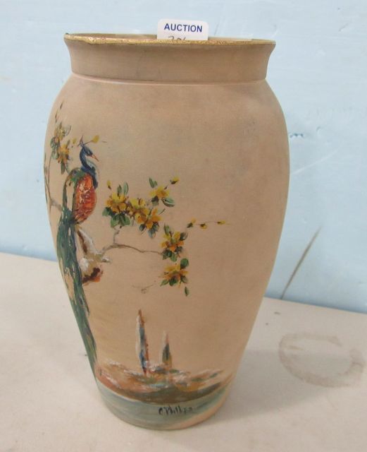 Bradentown, Florida, 1922, Peacock Design, Artist C. Phillips, 7"h., 3 1/2"dia. Bradentown, Florida, 1922, Peacock Design, Artist C. Phillips, 7"h., 3 1/2"dia.