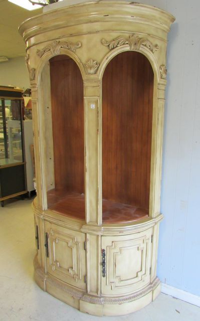 Display, modern piece, Open front with two glass shelves, french style, three door on bottom, lighted, 84"h., 52"w. Display, modern piece, Open front with two glass shelves, french style, three door on bottom, lighted, 84"h., 52"w.