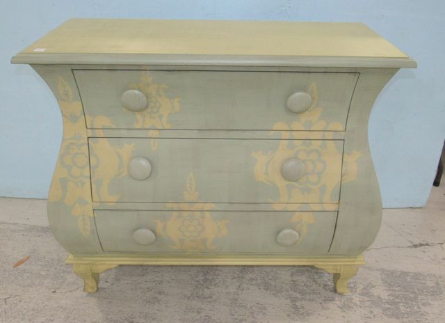 Three drawer, machine distressed, stencil design, 36"h., 42"w. Three drawer, machine distressed, stencil design, 36"h., 42"w.