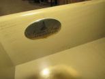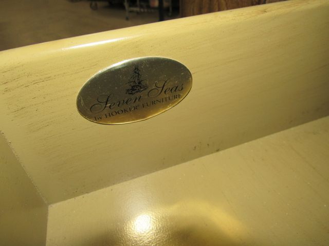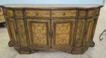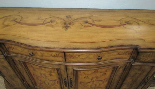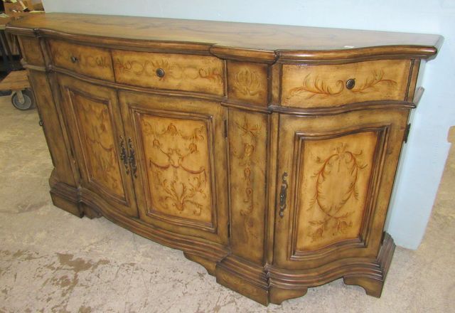 Machine made distressed finish with stencil designs, modern piece, 40"h., 85"w., 21"d. Machine made distressed finish with stencil designs, modern piece, 40"h., 85"w., 21"d.