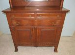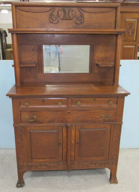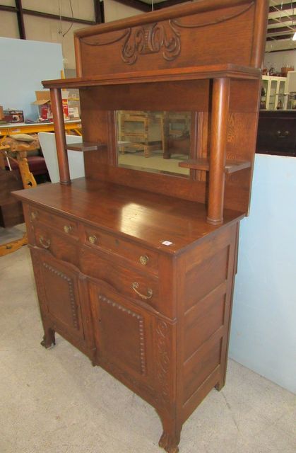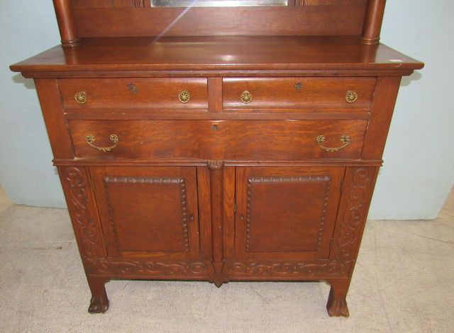Brass pulls, carved feet, backsplash with mirror, crest design, has some wear, 70"h., 42"w., 18"d. Brass pulls, carved feet, backsplash with mirror, crest design, has some wear, 70"h., 42"w., 18"d.
