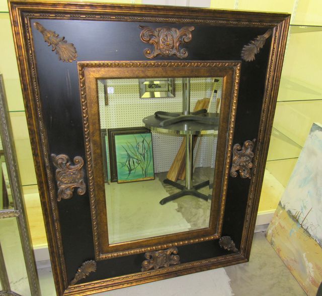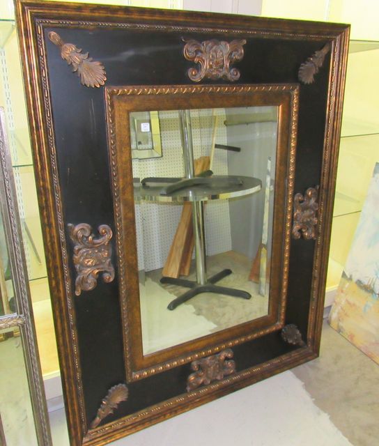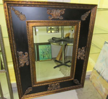 Gold and Black with french style accents, beveled mirror, 60"h., 47"w. Gold and Black with french style accents, beveled mirror, 60"h., 47"w.