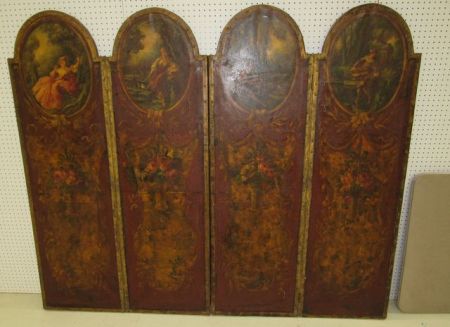 Age cracking design, some repaired spots, European scene, board on back connecting all four., 67"h., 80"w. Age cracking design, some repaired spots, European scene, board on back connecting all four., 67"h., 80"w.