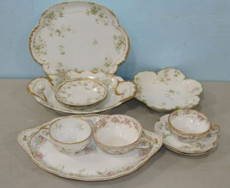 Serving Dishes 2"h. 11"w., three cups, four saucers, mixed patterns. Serving Dishes 2"h. 11"w., three cups, four saucers, mixed patterns.