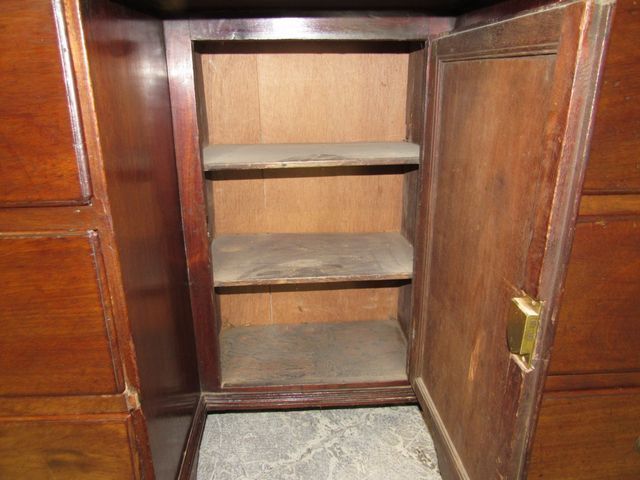 Leather top inset, 6 drawers, interior door, back has new panel, 32"h., 57"w., 23"d. Leather top inset, 6 drawers, interior door, back has new panel, 32"h., 57"w., 23"d.