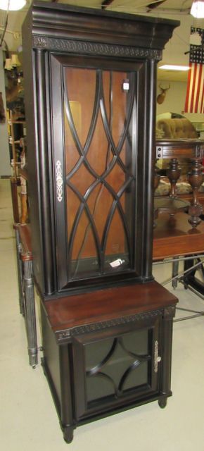 Lighted, glass shelves, made china, 76"h., 25"w. Lighted, glass shelves, made china, 76"h., 25"w.