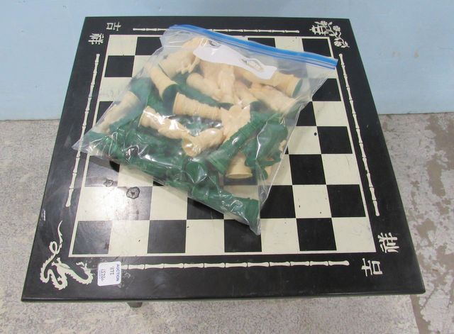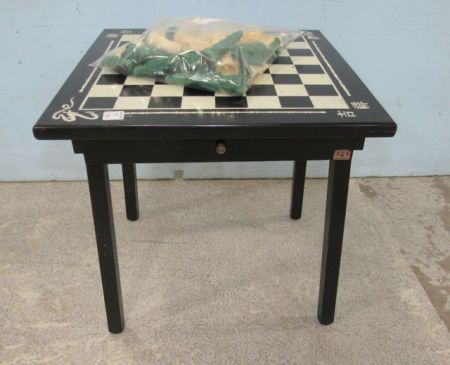 Stencil playing board on top, one drawer, with pieces. 18"h., 18"w. Stencil playing board on top, one drawer, with pieces. 18"h., 18"w.