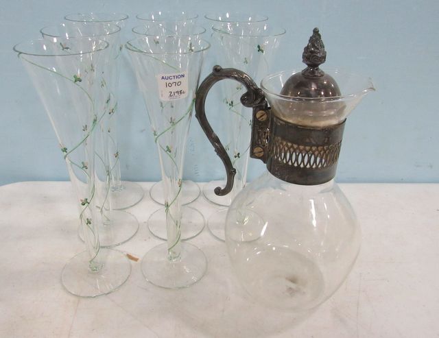 1070 Eight Decor Flutes and Silver Plate Water Pitcher
