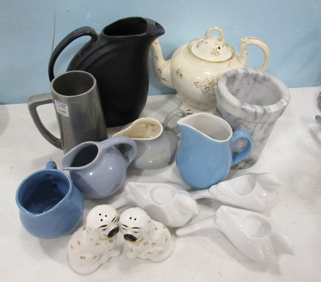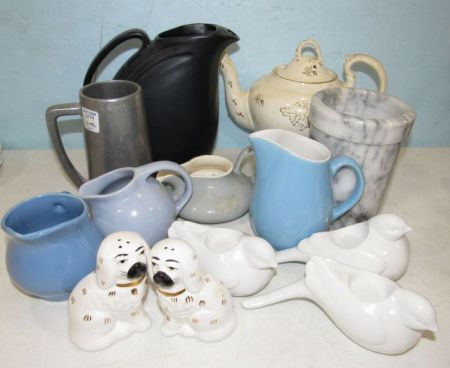 Pitchers, Sengware, Marble compartment, Dog salt and pepper, bird candleholders. Pitchers, Sengware, Marble compartment, Dog salt and pepper, bird candleholders.