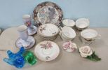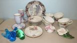 Porcelain flower, Japanese Cups, Saucers, Norleans Cups, Signed Glass Birds, Toyo Japanese Plate. Porcelain flower, Japanese Cups, Saucers, Norleans Cups, Signed Glass Birds, Toyo Japanese Plate.