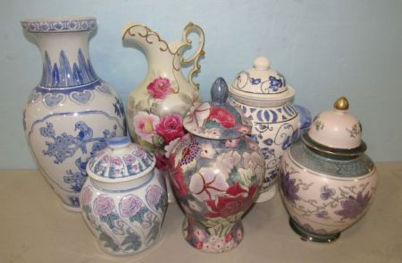 Ardco floral pitcher14"h., Blue and White Vase 14"h., Covered Jar 10"h., Three Covered Jars. Ardco floral pitcher14"h., Blue and White Vase 14"h., Covered Jar 10"h., Three Covered Jars.