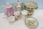 Pink hand painted teapot 15"h., Noritake Pitcher, Modern Ceramic Urn 8"h., 7"w., Noritake Tea Cups, Japanese Plate. Pink hand painted teapot 15"h., Noritake Pitcher, Modern Ceramic Urn 8"h., 7"w., Noritake Tea Cups, Japanese Plate.