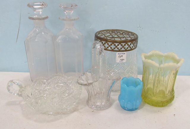 Pressed glass nappy, Cut glass jar with brass frog lid, glass decanters, glass basket, Vaseline & Opalescent Glass Spooner (has chip on bottom), Custard Glass Toothpicker. Pressed glass nappy, Cut glass jar with brass frog lid, glass decanters, glass basket, Vaseline & Opalescent Glass Spooner (has chip on bottom), Custard Glass Toothpicker.