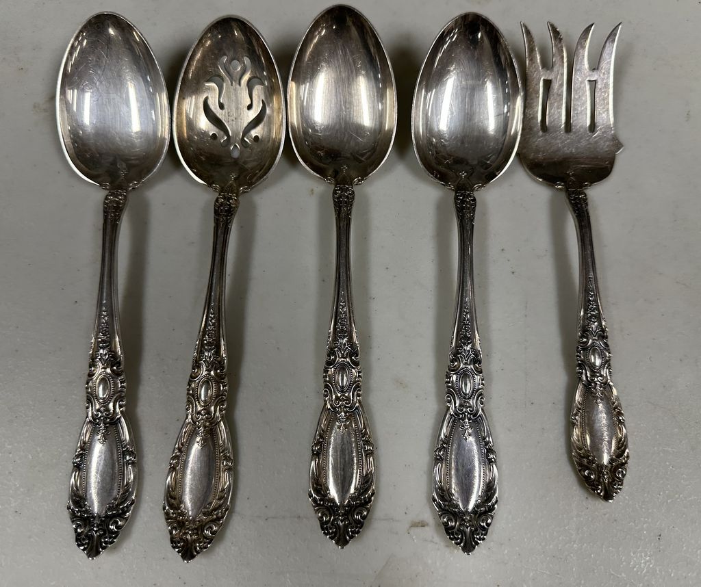 Towle "King Richard" Sterling Meat Fork, 3 Serving Spoons, Slotted Spoon, 15.525 ozt, Location Case by Office Towle "King Richard" Sterling Meat Fork, 3 Serving Spoons, Slotted Spoon, 15.525 ozt, Location Case by Office
