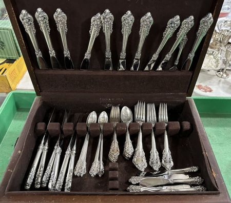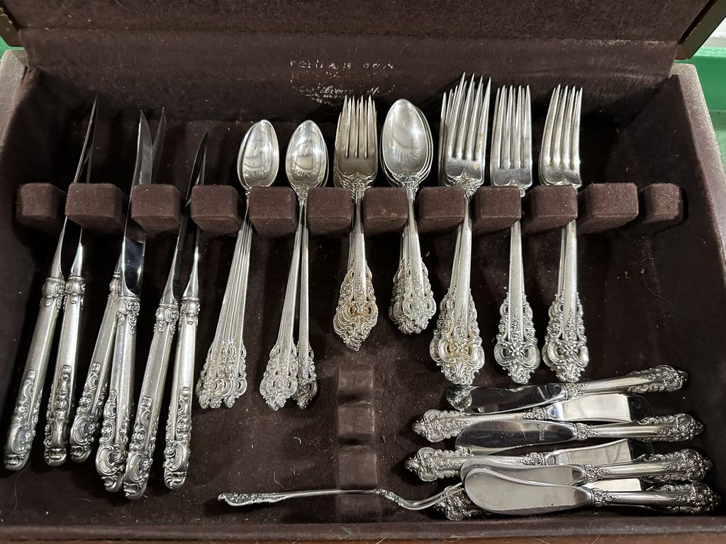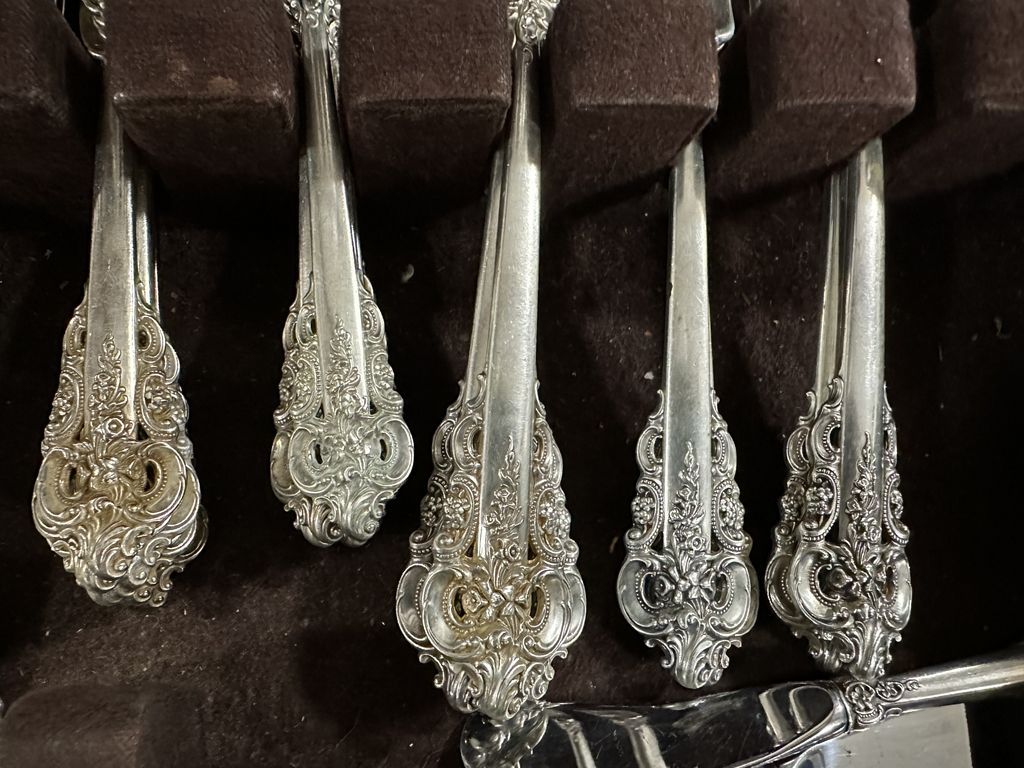 Wallace Grande Baroque Sterling Flatware, 10 knives, 6 steak knives, 8 ice tea spoons, cocktail fork, 9 spoons, 8 lunch forks, 10 forks, 7 butter knives, 56.215 ozt, knives not included weight, Location Case by Office Wallace Grande Baroque Sterling Flatware, 10 knives, 6 steak knives, 8 ice tea spoons, cocktail fork, 9 spoons, 8 lunch forks, 10 forks, 7 butter knives, 56.215 ozt, knives not included weight, Location Case by Office