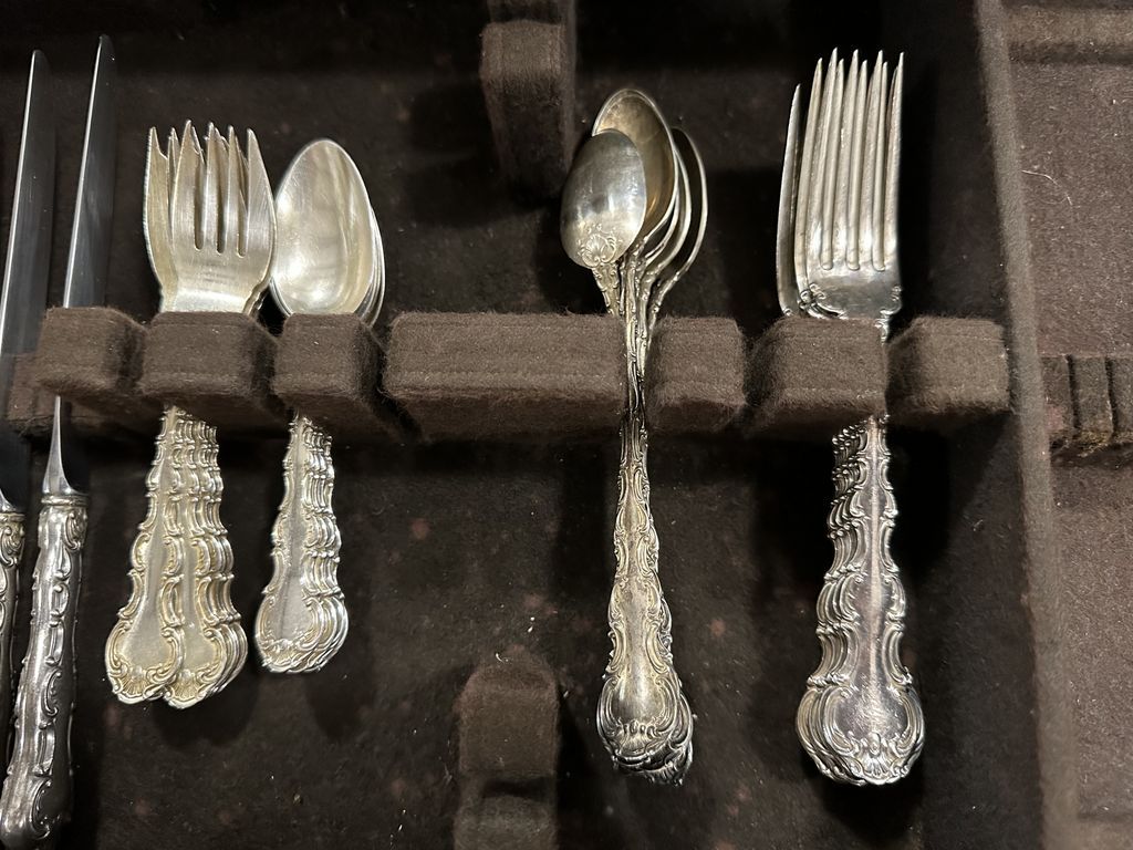 Gorham Strasbourg Sterling Flatware, 7 salad forks, 6 spoons, 9 ice teas, 8 forks, 6 knives, 42.195 ozt, knives not included weight, Location Case by Office Gorham Strasbourg Sterling Flatware, 7 salad forks, 6 spoons, 9 ice teas, 8 forks, 6 knives, 42.195 ozt, knives not included weight, Location Case by Office