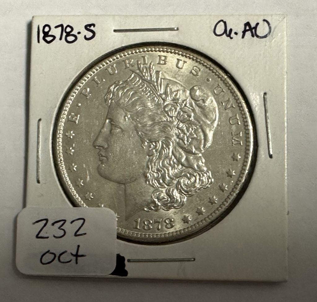 1878-S Morgan Silver Dollar AU, paper case, Location safe 1878-S Morgan Silver Dollar AU, paper case, Location safe