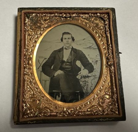 1800's Ambrotype of Gentleman, leather case with ornate brass framing, missing front on case, 4"h., 3 1/8"w., Location Case by Office 1800's Ambrotype of Gentleman, leather case with ornate brass framing, missing front on case, 4"h., 3 1/8"w., Location Case by Office