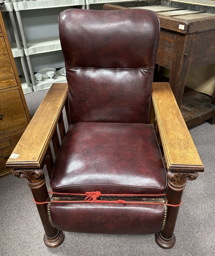 Antique Morris Style Recliner Chair, oak, column style, light age wear, Location Left Office 1 Antique Morris Style Recliner Chair, oak, column style, light age wear, Location Left Office 1