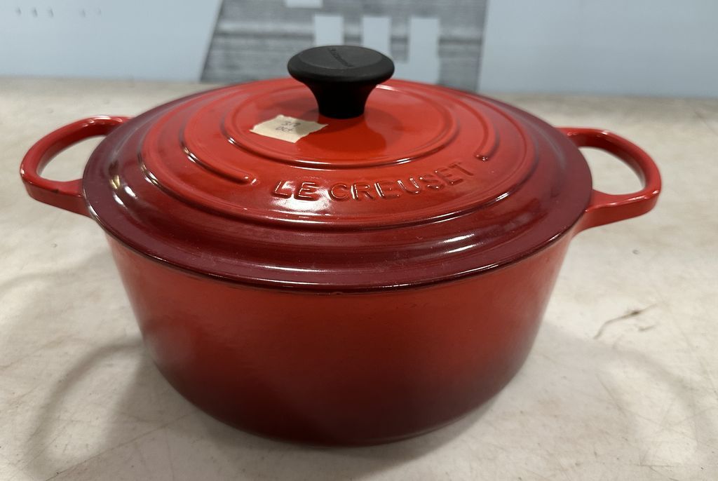 France Le Creuset Casserole, lidded, good condition, Location Right Metal Shelves France Le Creuset Casserole, lidded, good condition, Location Right Metal Shelves