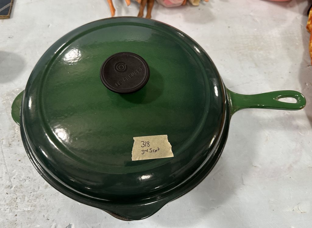 France Le Creuset Casserole, lidded, good condition, Location Right Metal Shelves France Le Creuset Casserole, lidded, good condition, Location Right Metal Shelves