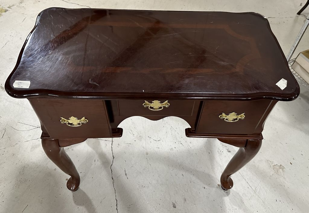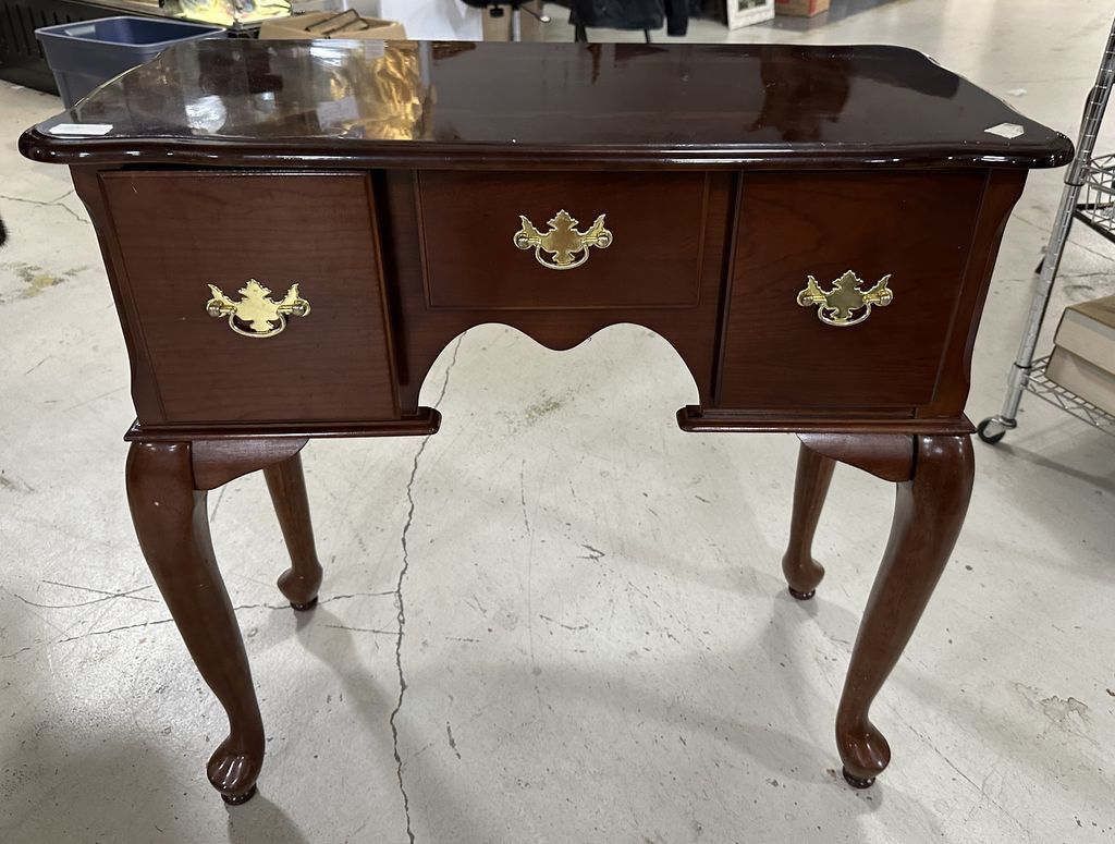 Modern Cherry Queen Anne Console Table, 30"h., 32"w, one leg repaired, swirls on finish. Location Row 3 Modern Cherry Queen Anne Console Table, 30"h., 32"w, one leg repaired, swirls on finish. Location Row 3