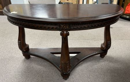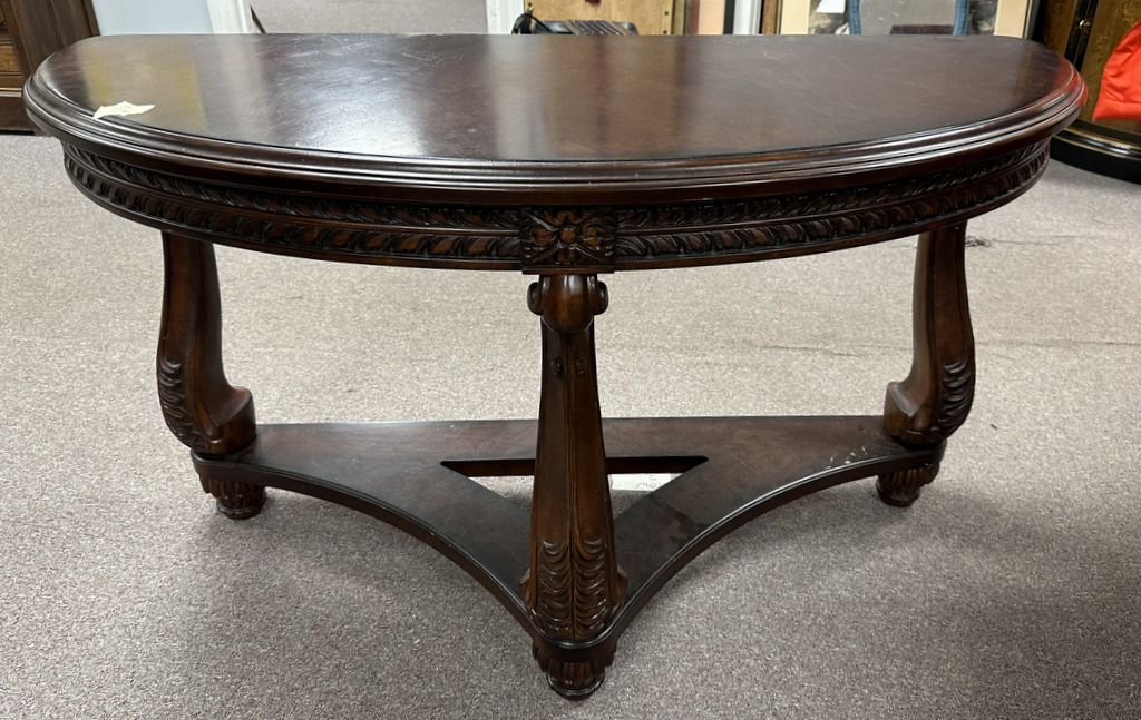 Antique Reproduction Cherry Demilune Console Table, 29"h., 47"w. Location Left Office 1 Antique Reproduction Cherry Demilune Console Table, 29"h., 47"w. Location Left Office 1