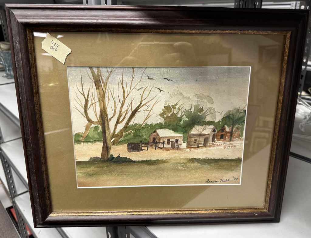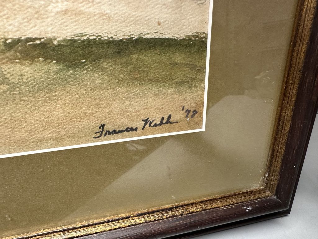 Frances Webb Watercolor of Farm Place, matted, framed, 15"h., 18"w, Location Right Metal Shelves Frances Webb Watercolor of Farm Place, matted, framed, 15"h., 18"w, Location Right Metal Shelves