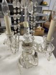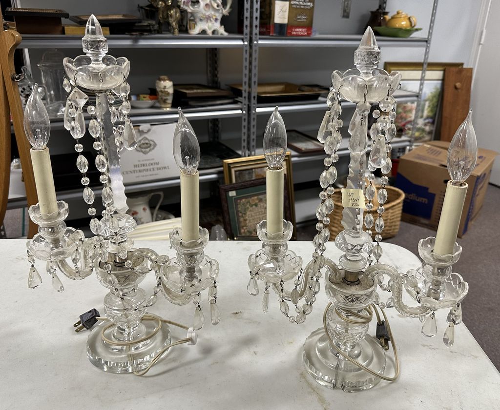 Pair of Crystal Table Candelabras, one with top repairs, missing some prisms, 19"h, Location Left Back Metal Shelves Pair of Crystal Table Candelabras, one with top repairs, missing some prisms, 19"h, Location Left Back Metal Shelves