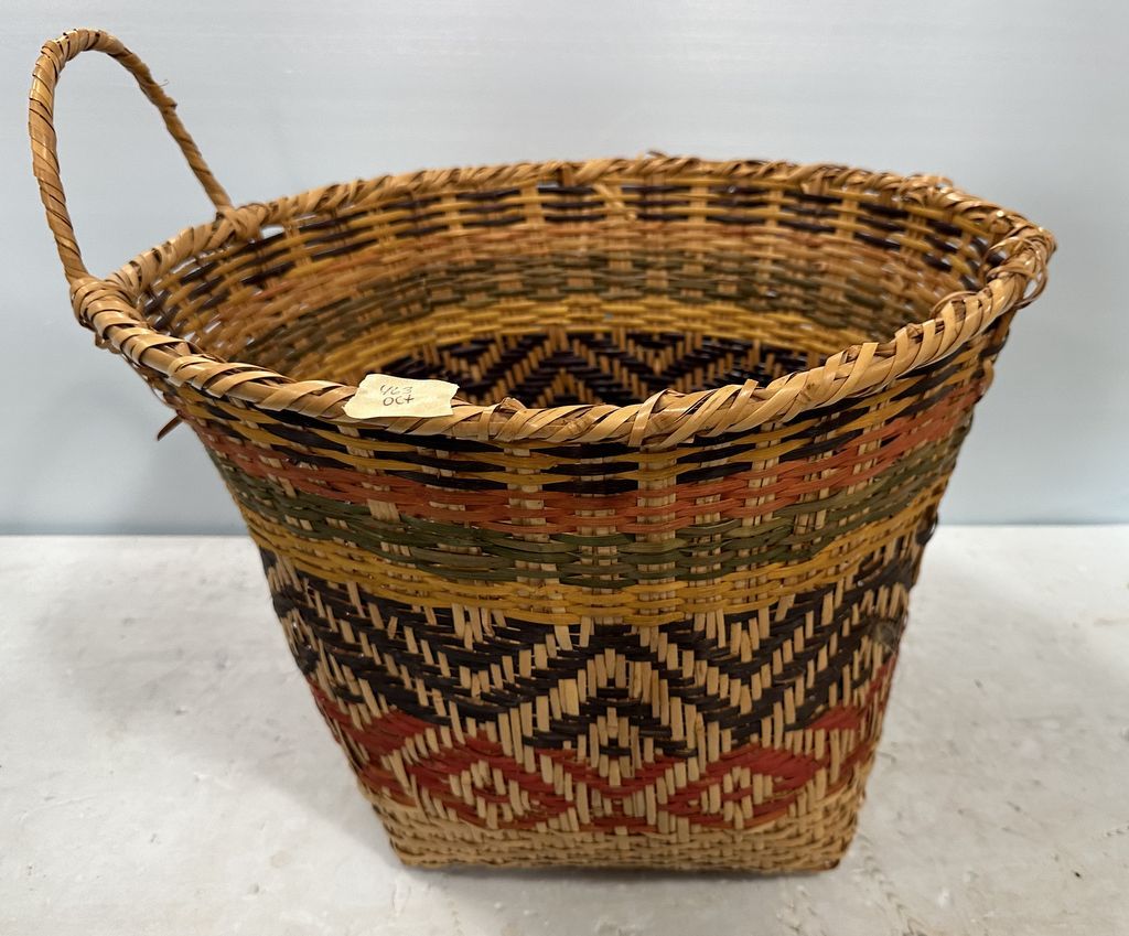 Large Woven Choctaw Carrying Basket, handle damage, 13"h., 18"w, Location Left Office 1 Large Woven Choctaw Carrying Basket, handle damage, 13"h., 18"w, Location Left Office 1