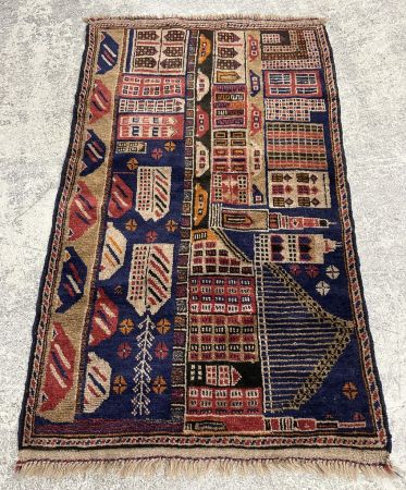 2'10 x 4' Hand Knotted Afghan War City View Rug , wool, good condition. Location Rug Rack 2'10 x 4' Hand Knotted Afghan War City View Rug , wool, good condition. Location Rug Rack