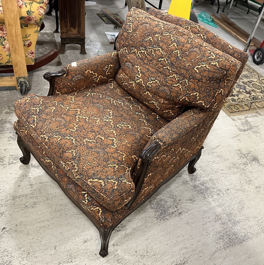 French Style Upholstered Arm Chair, good condition. Location Row 2 French Style Upholstered Arm Chair, good condition. Location Row 2