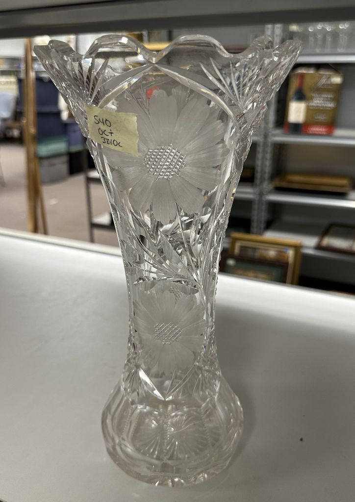 Cut Glass Tall Flower Vase, 12"h, Location Back Left Metal Shelves Cut Glass Tall Flower Vase, 12"h, Location Back Left Metal Shelves