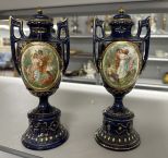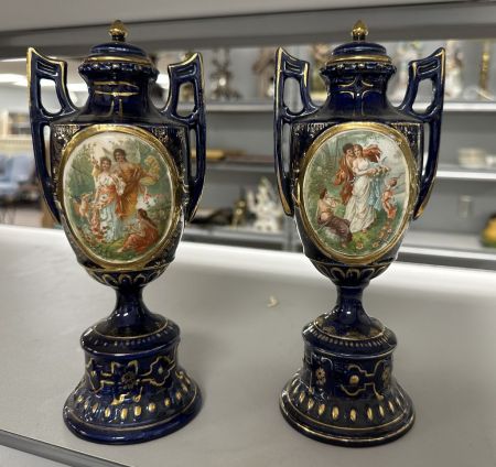 Pair of Vienna Lidded Porcelain Mini Urns, hand painted, 9"h, Location Back Left Metal Shelves Pair of Vienna Lidded Porcelain Mini Urns, hand painted, 9"h, Location Back Left Metal Shelves
