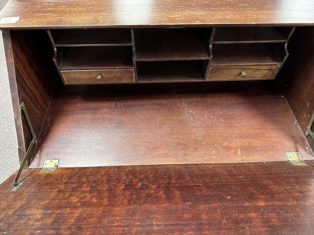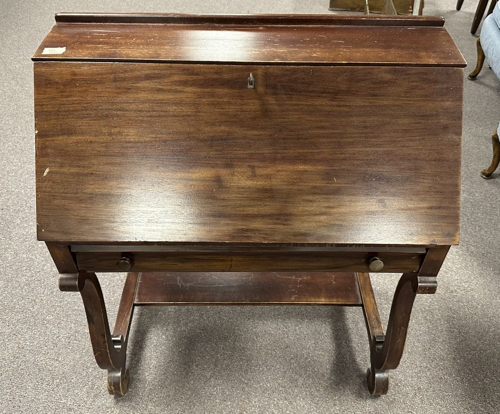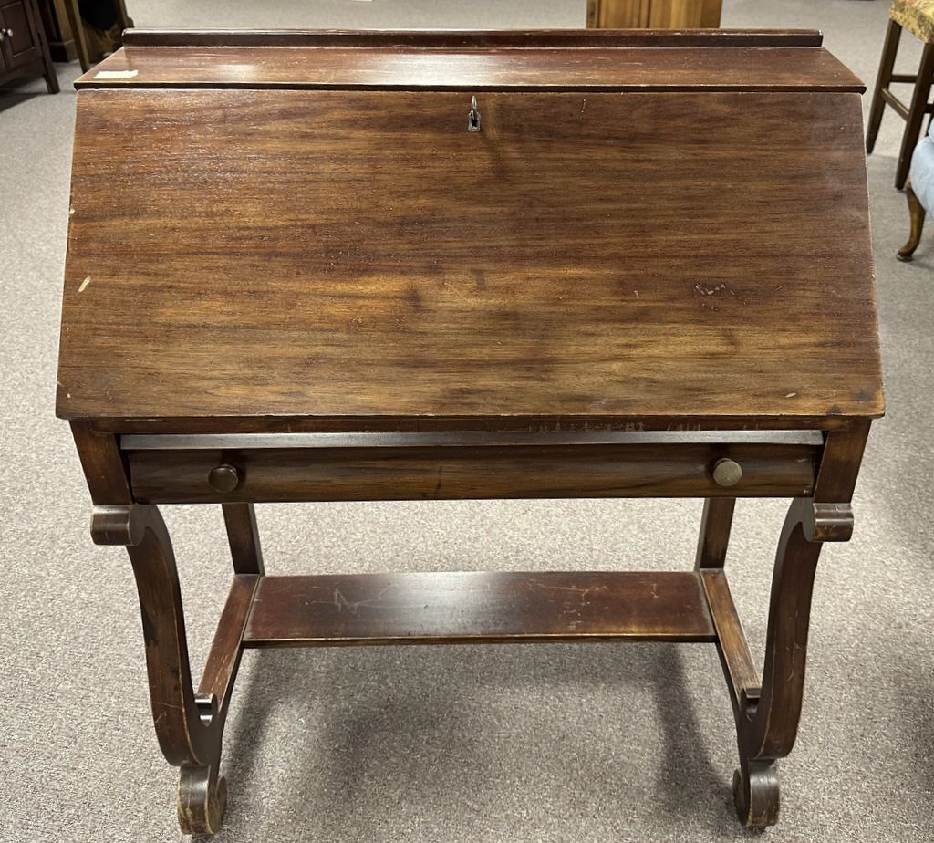 Antique Reproduction Empire Writing Desk, drop front, has worn areas on finish, 40"h., 33"w, 16"d. Location Row 5 Antique Reproduction Empire Writing Desk, drop front, has worn areas on finish, 40"h., 33"w, 16"d. Location Row 5