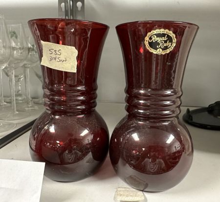 Pair of Royal Ruby Anchor Hocking Glass Vase, 6 1/2"h, Location Left Back Metal Cases Pair of Royal Ruby Anchor Hocking Glass Vase, 6 1/2"h, Location Left Back Metal Cases