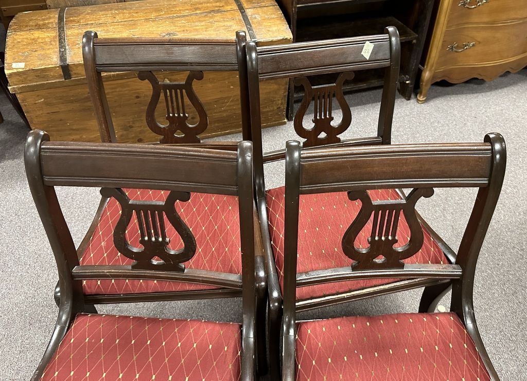 4 Duncan Phyfe Lyre Back Dining Chairs, Mahogany, has finish wear, Location Row 4 4 Duncan Phyfe Lyre Back Dining Chairs, Mahogany, has finish wear, Location Row 4