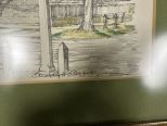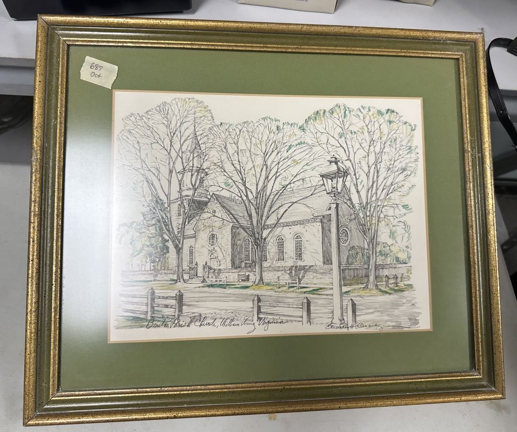 Signed Charles Print of Bruton Parish Church Williamsburg Virginia, 15" x 18", Location Right Metal Shelves Signed Charles Print of Bruton Parish Church Williamsburg Virginia, 15" x 18", Location Right Metal Shelves