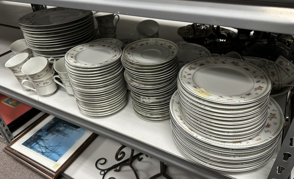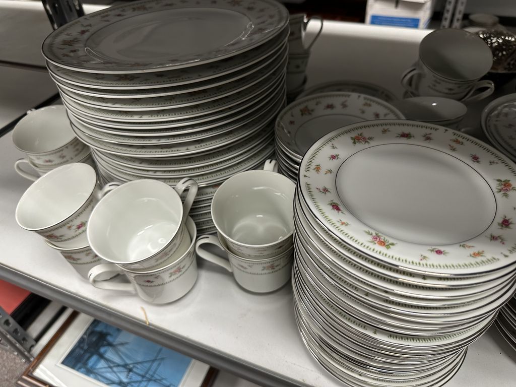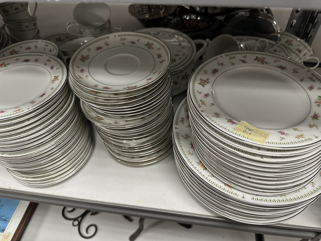 Large Set of Abington Japan China Set, dinner plates, plates, cups, and more, Location Right Metal Shelves Large Set of Abington Japan China Set, dinner plates, plates, cups, and more, Location Right Metal Shelves