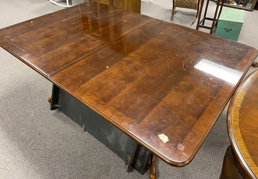 Modern Cherry Queen Anne Dining Table, two leaves, has scratch wear on top, 29"h., 67"w, Location Row 4 Modern Cherry Queen Anne Dining Table, two leaves, has scratch wear on top, 29"h., 67"w, Location Row 4