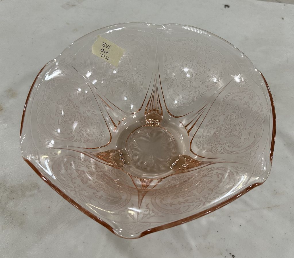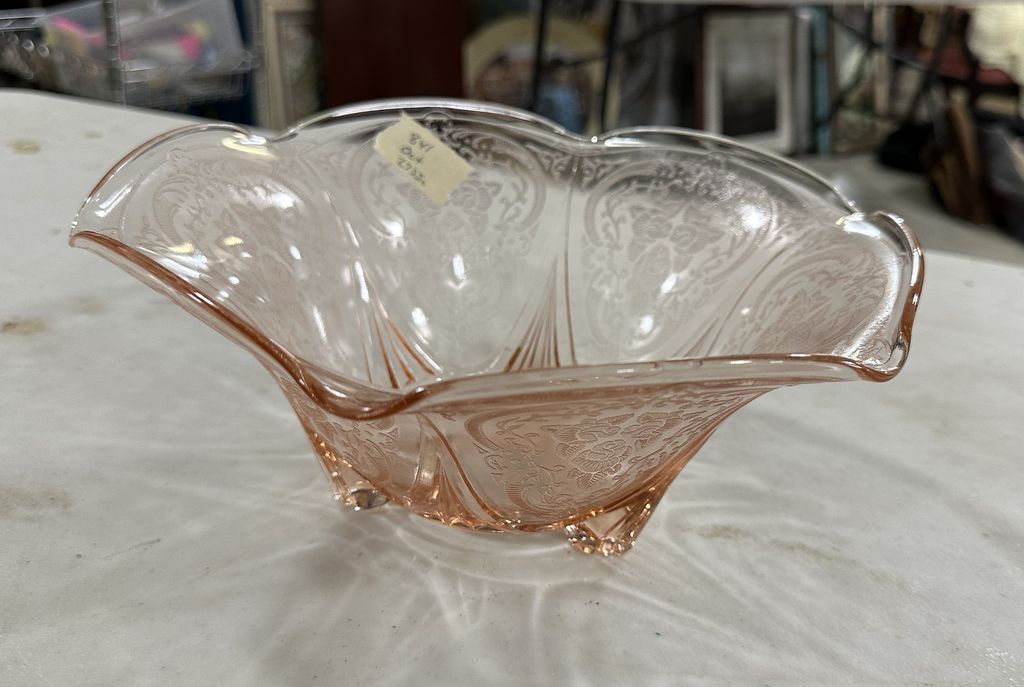 Etched Pink Depression Glass Footed Bowl, 10", Location Right Metal Shelves Etched Pink Depression Glass Footed Bowl, 10", Location Right Metal Shelves