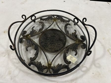Decorative Metal Center Piece Tray, glass bottom, 15"dia, Location Right Metal Shelves Decorative Metal Center Piece Tray, glass bottom, 15"dia, Location Right Metal Shelves